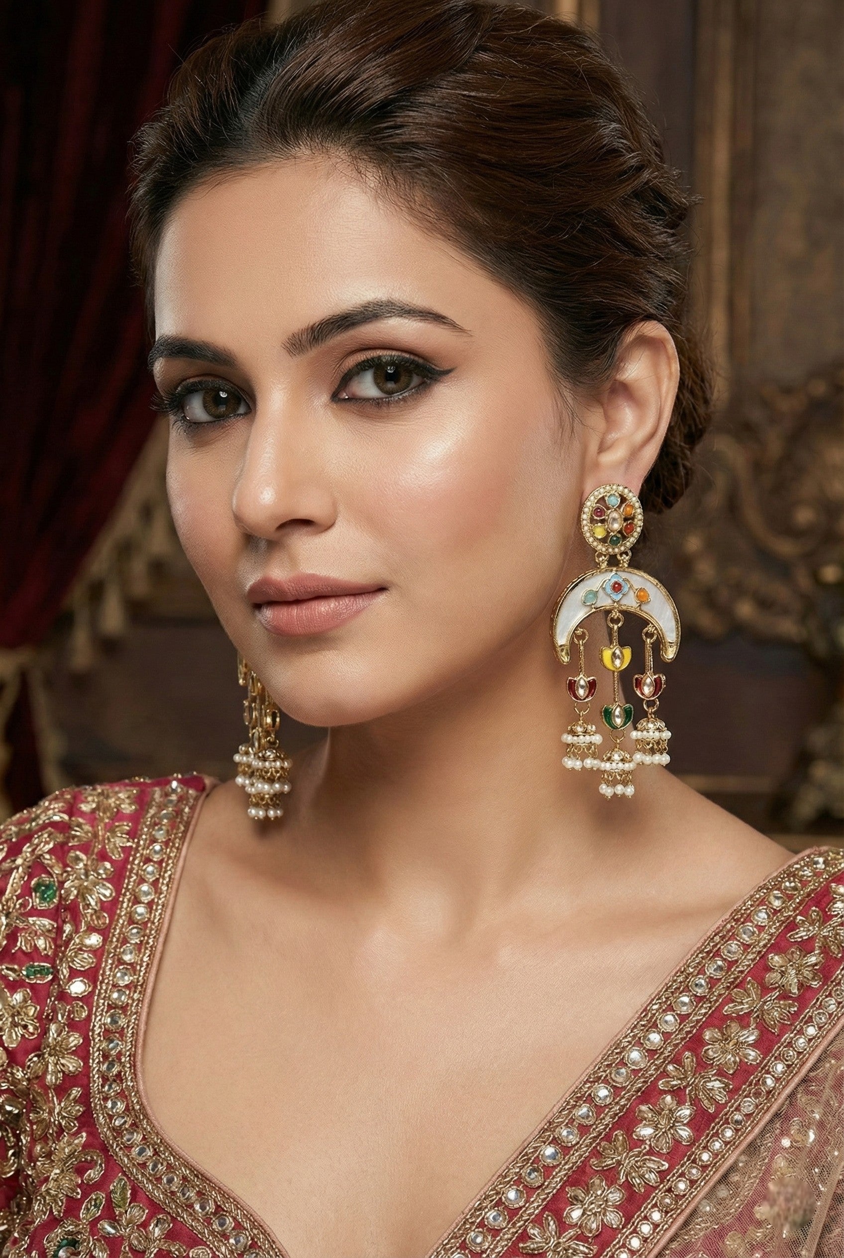 Elevate your ethnic jewellery collection with these premium Polki style chandbali jhumka earrings, designed to reflect timeless Indian elegance. Featuring finely set Polki stones, detailed craftsmanship, and graceful pearl drop embellishments, these earrings bring together traditional artistry and contemporary sophistication. The chandbali-inspired upper design flows beautifully into classic jhumka danglers, creating a striking statement look. Perfect for weddings, festive occasions, and special celebrations, these earrings pair effortlessly with sarees, lehengas, and ethnic ensembles. A must-have accessory for women who appreciate heritage-inspired luxury jewellery.