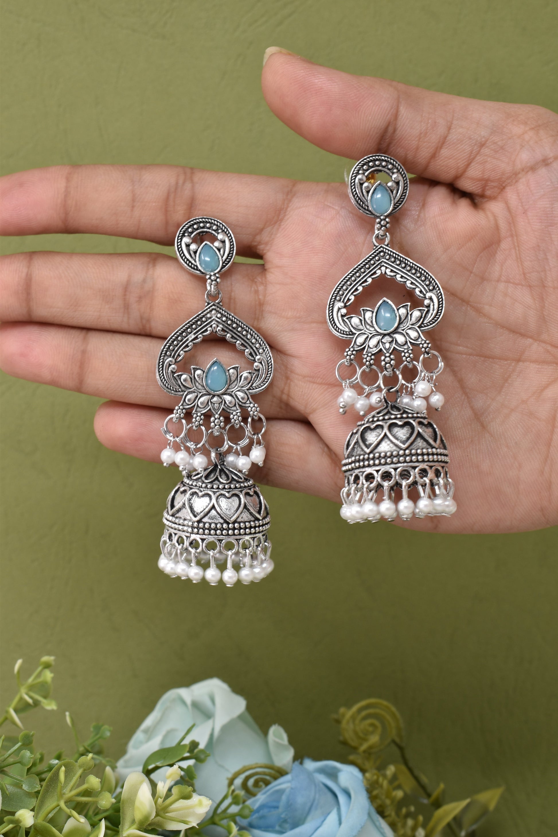 Partywear-earrings,chandeliar,partywear,Kashmiri earring,JHUMAR-OXOJMK-JRV-3STP-LOTUS-SBLU